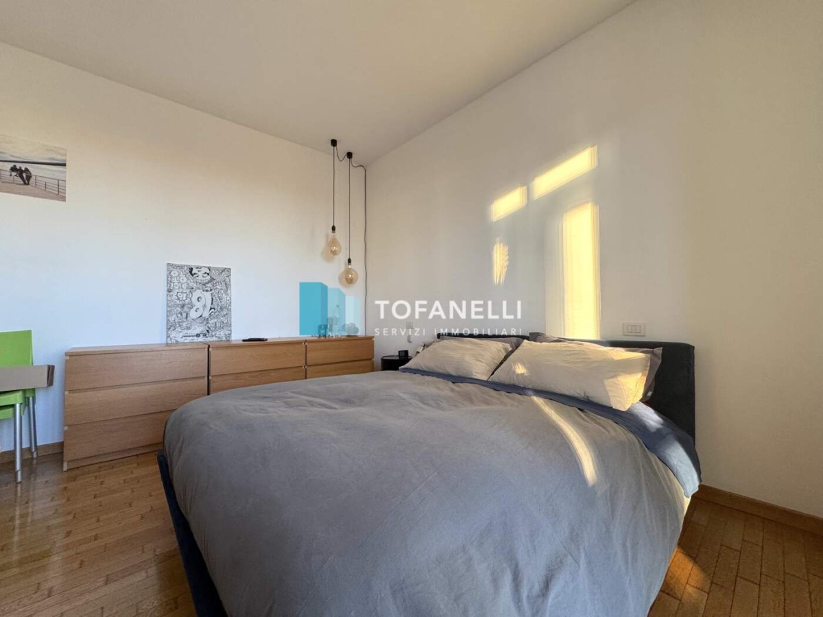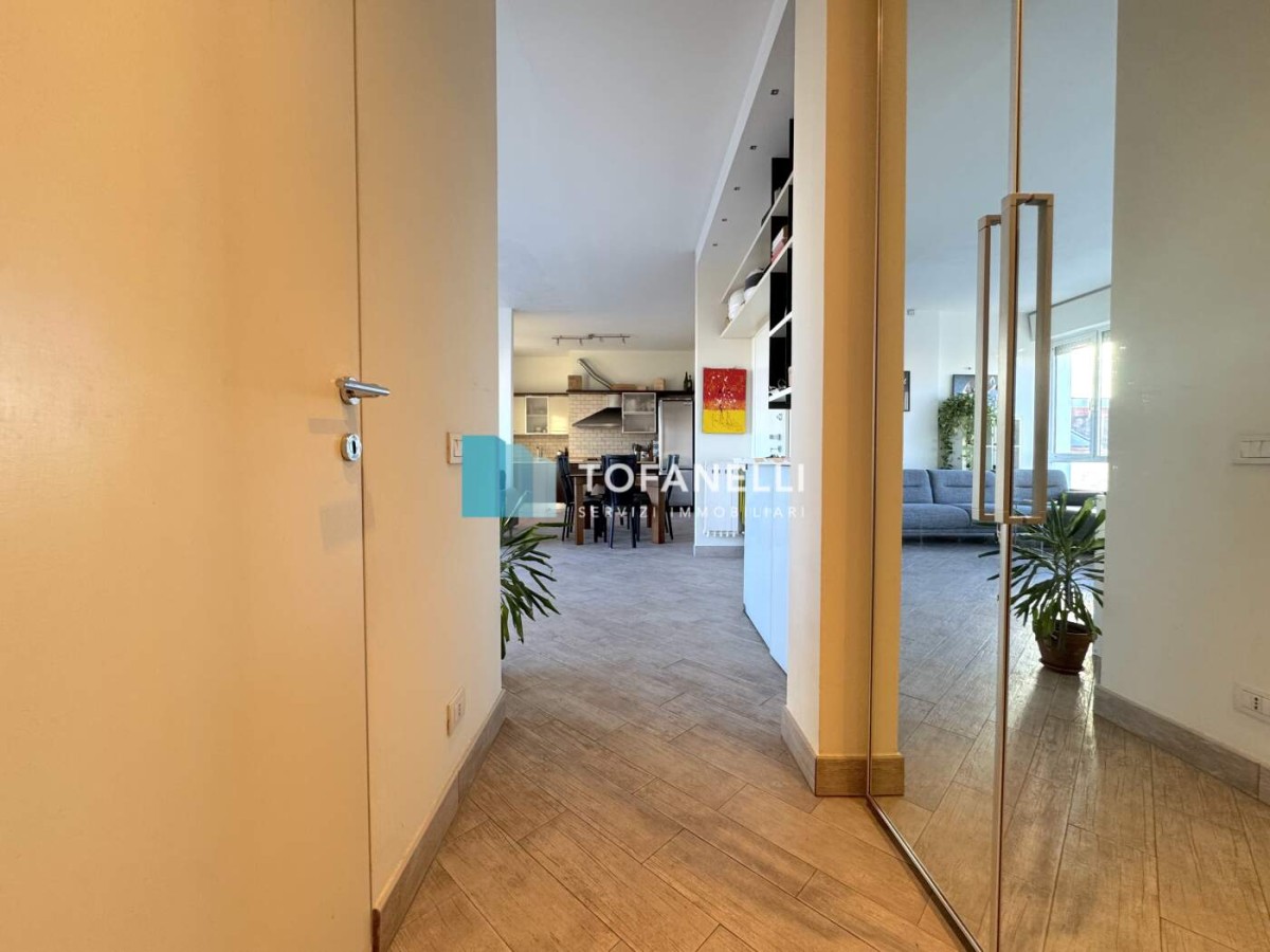 Internamente l’immobile si sviluppa al quarto piano: varcato l’ingresso ci accoglie l’ampia zona living, composta da un luminoso soggiorno con accesso diretto al balcone e cucina a vista. Un comodo disimpegno con armadiatura su misura conduce alla zona notte, dove troviamo il bagno ristrutturato, completo di doccia walk-in e sanitari sospesi, e la camera matrimoniale, anch’essa con accesso al balcone.