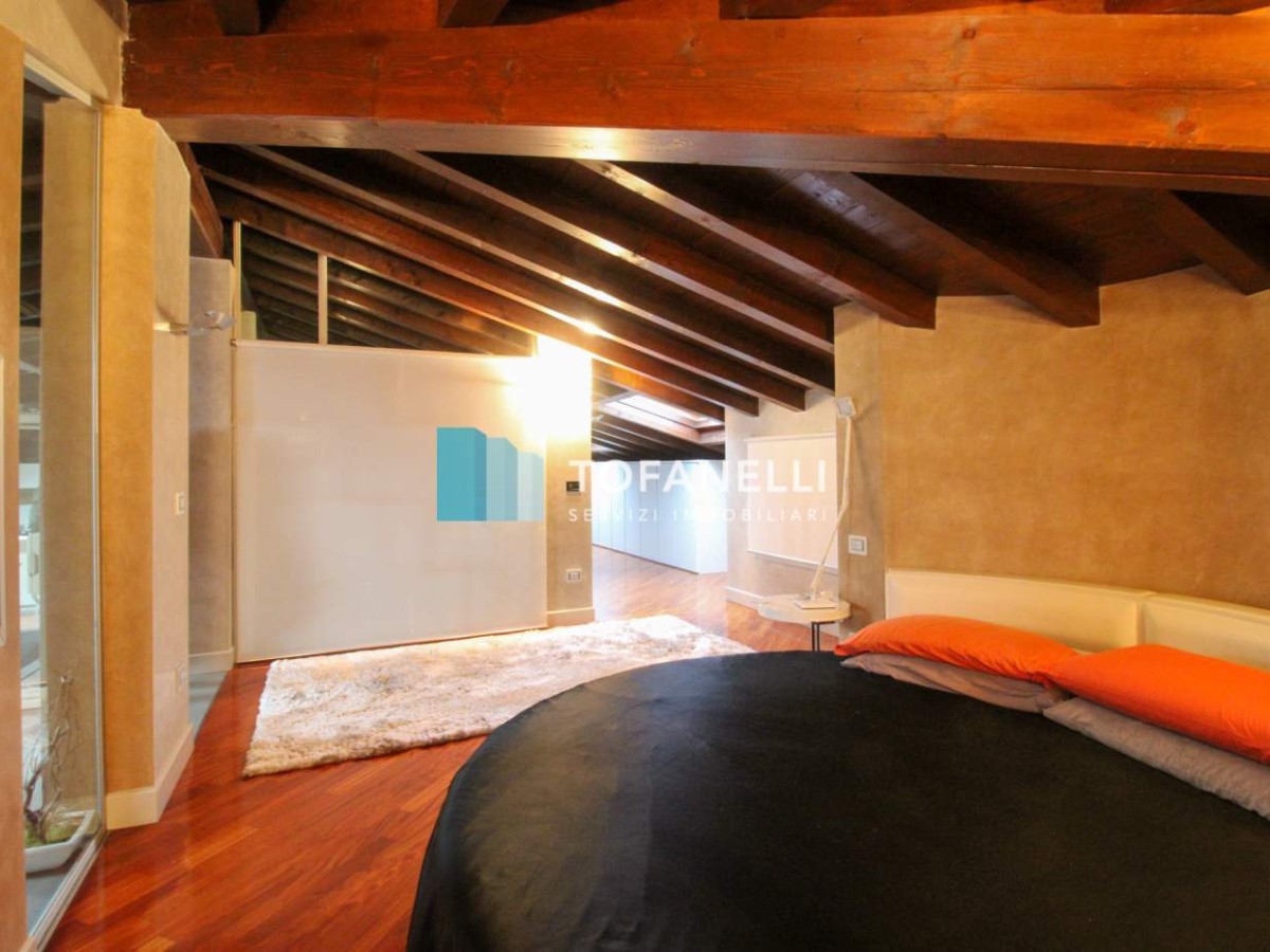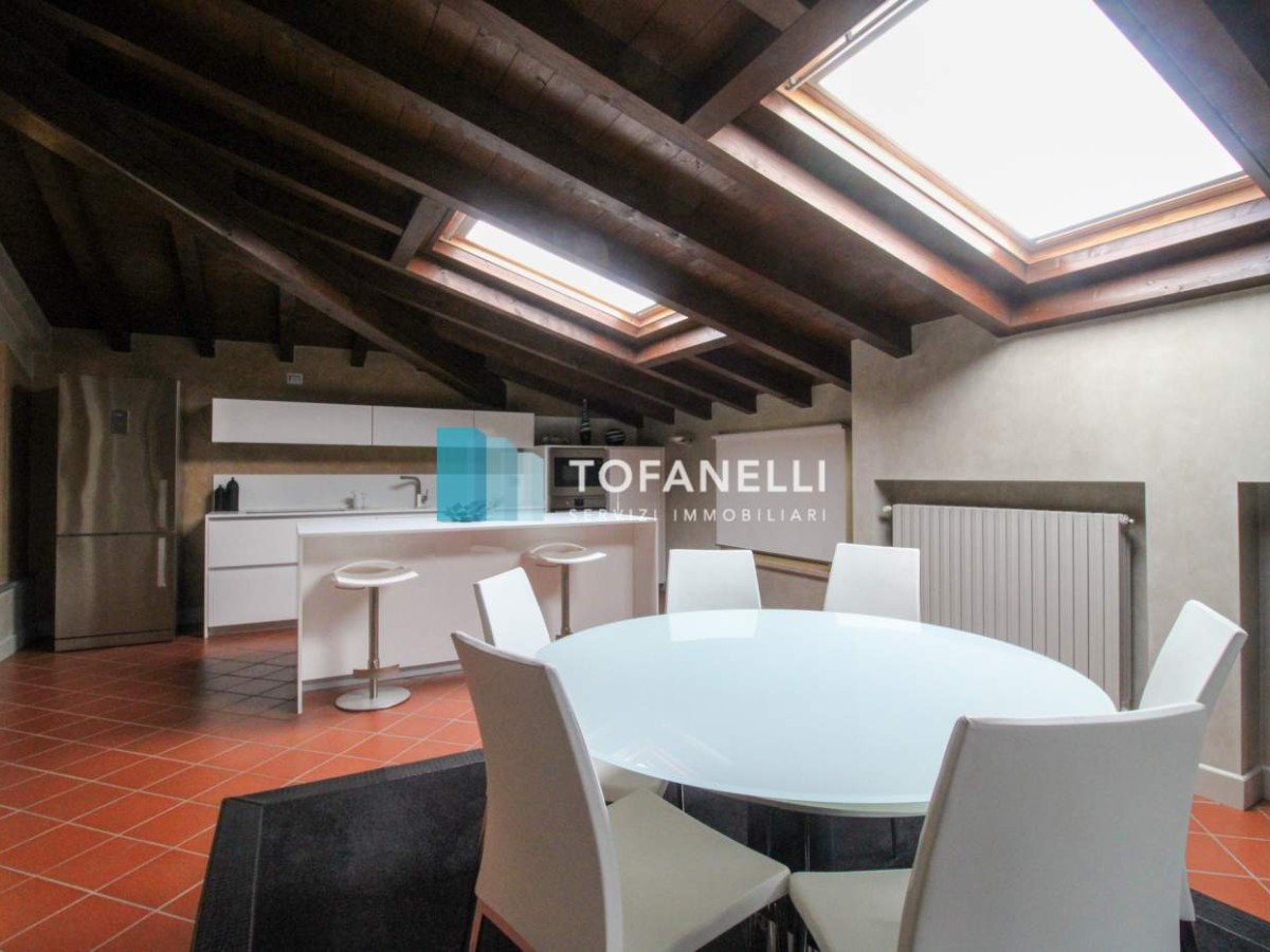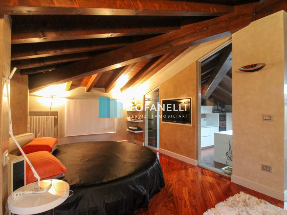 Mansarda caratterizzata da travi a vista color legno, composta da soggiorno con cucina a vista su misura, camera da letto collegata al bagno finestrato che serve il piano.