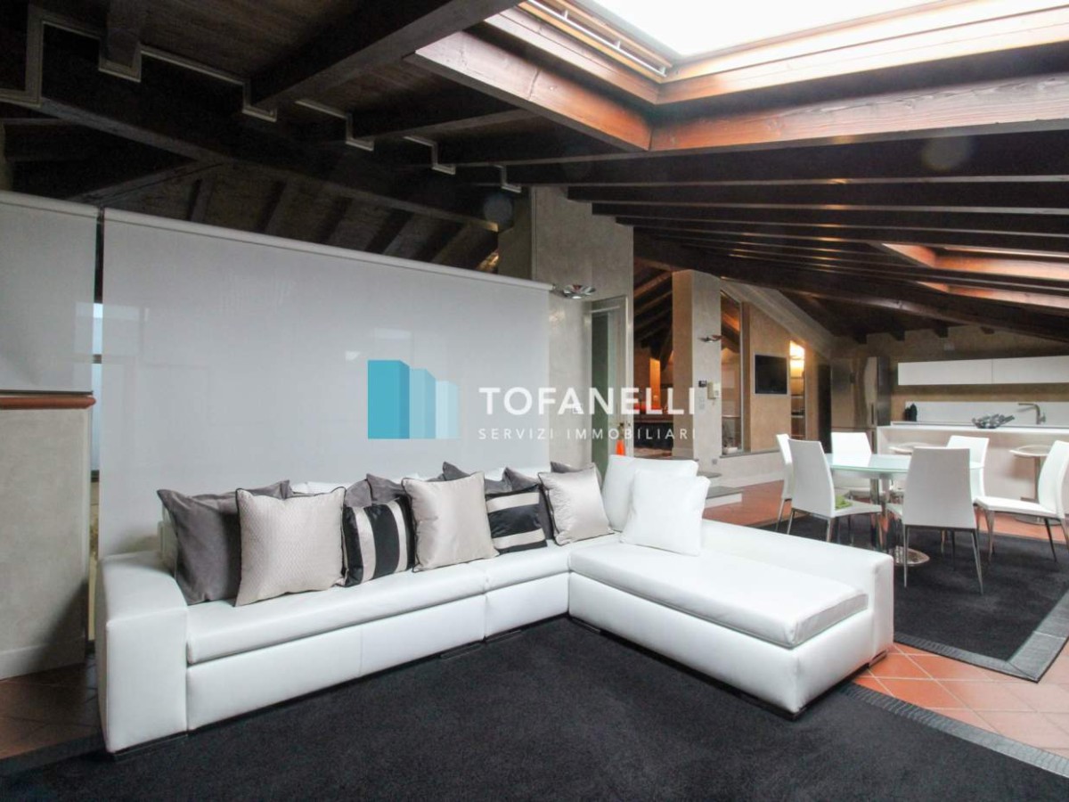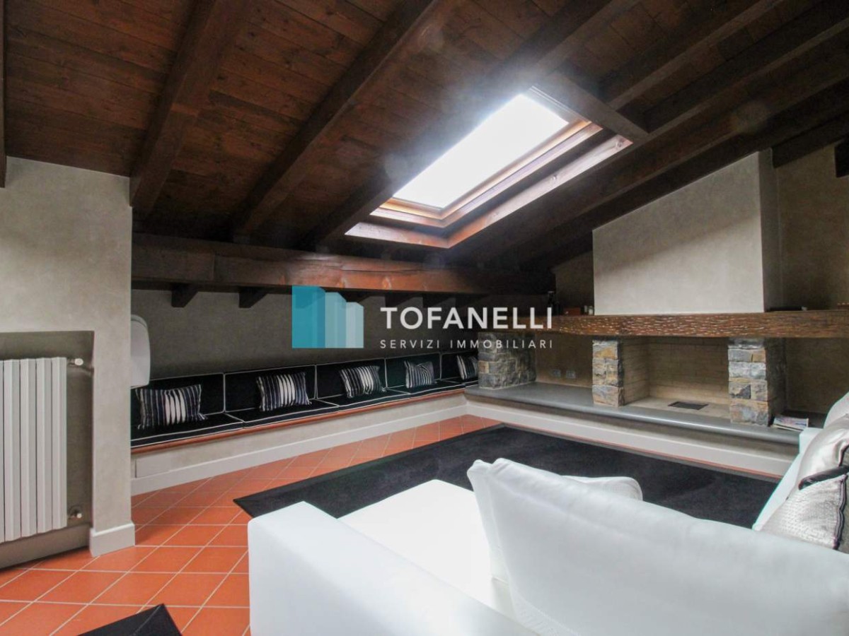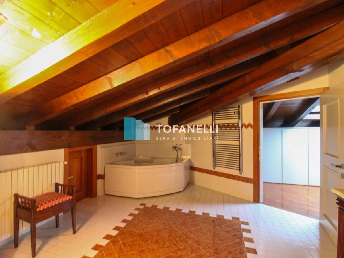 Mansarda caratterizzata da travi a vista color legno, composta da soggiorno con cucina a vista su misura, camera da letto collegata al bagno finestrato che serve il piano.