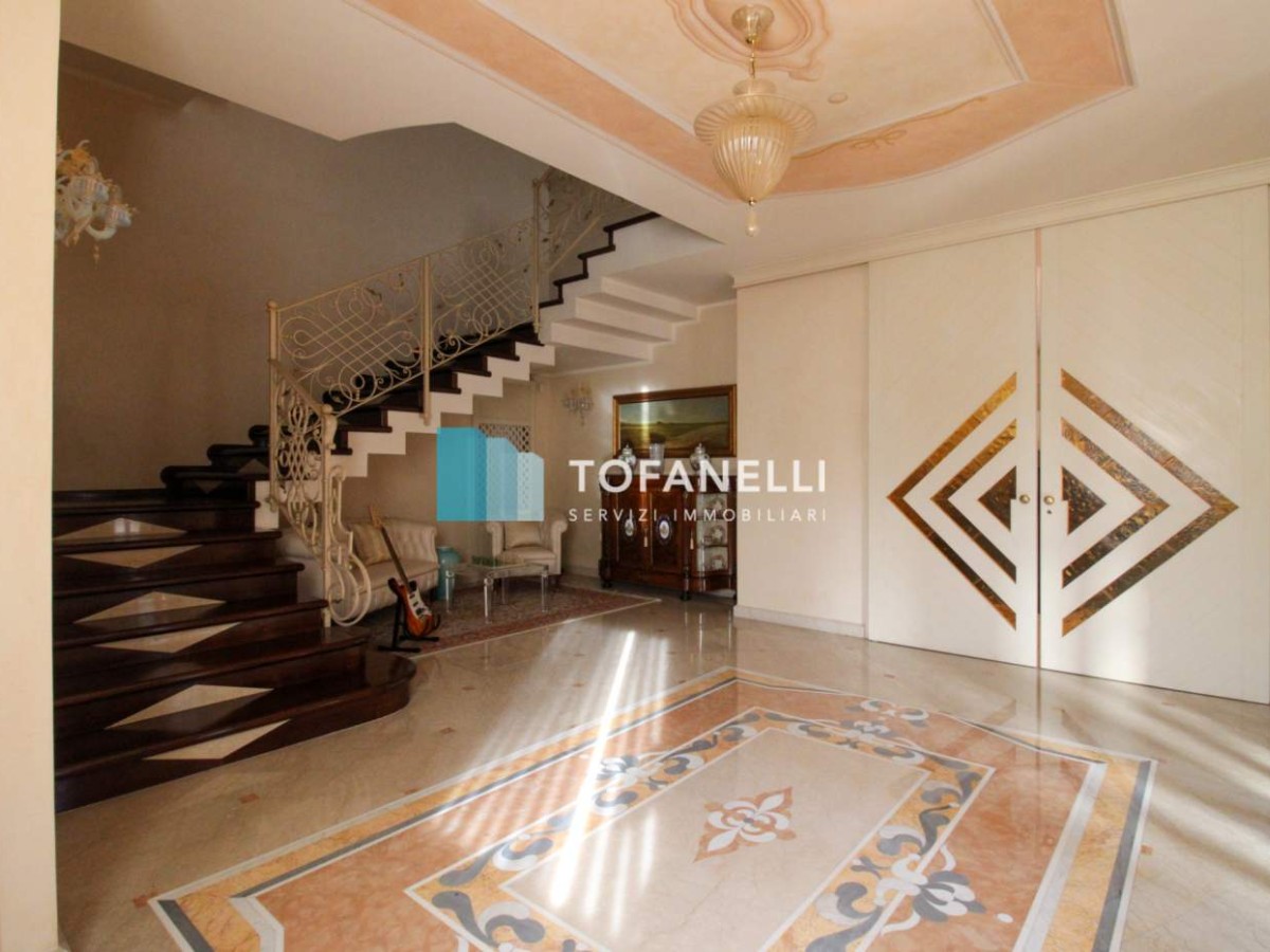 L’ingresso si apre su un elegante atrio con affaccio su una scala importante e padronale che conduce al piano superiore.